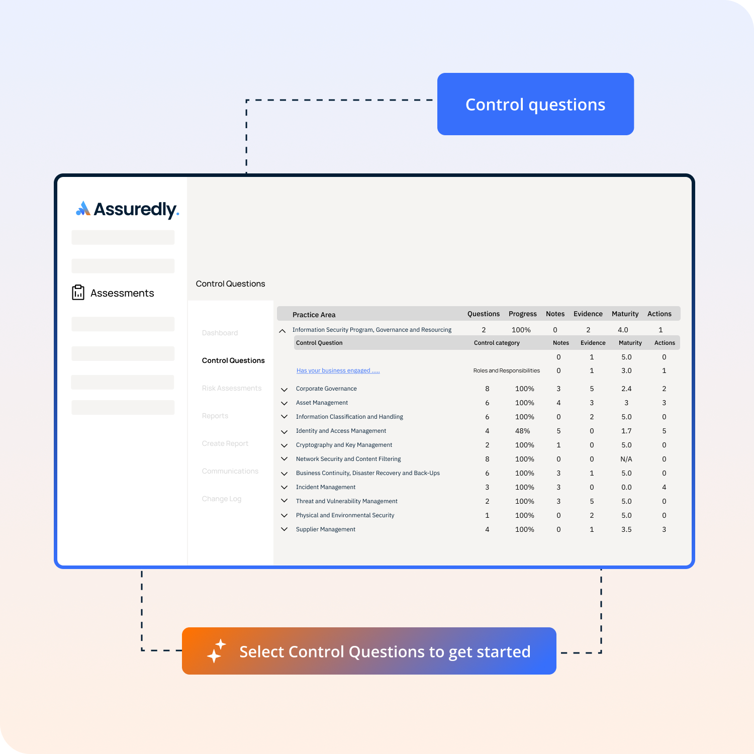 Control assessments is where we help you describe your security controls. Your responses are carefully assessed, using our proprietary Applied Experience platform, for how mature they are and if they meet the requirements of any standard you have included in the scope of the assessment.