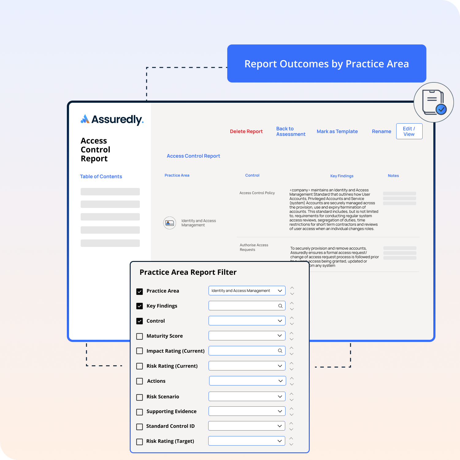 Assuredly allows you to report the outcomes of your control assessments by Practice Area.